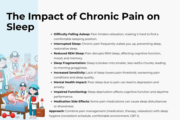 Sleep and Chronic Pain Chronic Pain, Disturbed Sleep, How Osteopathy Can Help Before we dive in… If you’ve ever spent a night tossing and turning because something is painful, you already know the truth: pain and sleep are deeply connected. What many people don’t realise is how strongly each one affects the other. Poor sleep can make pain feel worse—and worse pain can make sleep nearly impossible. Over time, this creates a cycle that affects not only your nights leaving you exhausted and drained but can have severe consequences for your health and well-being. It can lead to fatigue, irritability, depression, anxiety, a weakened immune system, increased risk of heart disease and stroke, weight gain, headaches, musculoskeletal pain, and even an increased risk of death. Chronic pain is a common issue that can significantly impact a person’s quality of life, including their ability to sleep. Sleep disturbance is a major symptom for individuals suffering from conditions such as: • Back and neck pain • Arthritis • Fibromyalgia • Migraines and tension headaches • Neuropathic pain (e.g., sciatica, diabetic nerve pain) • Injuries or post-surgical pain • TMJ/jaw pain Long-term sleep deprivation can also affect your cognitive abilities, such as memory, concentration and decision-making. In addition to these physical effects, chronic sleep deprivation can negatively impact your relationships and work performance. While medications and traditional treatments are common solutions, a growing number of individuals are turning to osteopathy for help. Osteopathy can be a natural and effective approach to help overcome these problems. Understanding the Connection Between Chronic Pain and Sleep Insomnia and other sleep disorders are linked to the central nervous system. Insomnia can be caused by trauma, stress, anxiety, or circulatory problems. Physical pain can keep the nervous system on high alert, making it difficult to achieve restful sleep. It can cause irritability and increase pain signals. The more severe the pain, the more challenging it is for the body to read sleep signals accurately. The nervous system is made up of two parts: the parasympathetic and sympathetic nervous systems. These two systems manage the entire body’s unconscious activities, such as respiration, heartbeat, circulation, digestion, and all bodily functions automatically, without conscious thought. The spine is directly connected to the central nervous system via its peripheral nerves. A vertebral misalignment can disrupt the nervous system to the point of causing insomnia. Understanding Osteopathy and Its Connection to Sleep Osteopathy is a hands-on, non-invasive therapy that focuses on the musculoskeletal system and its impact on overall health. By addressing structural imbalances and promoting proper function, osteopathy can help relieve tension, reduce pain, and enhance circulation—all of which contribute to better sleep. Here are some key, ways osteopathy can improve sleep quality: Soft Tissue Manipulation : This technique involves the gentle stretching and massaging of muscles and connective tissues. It helps relieve muscle tension, reduce inflammation, and improve blood flow, which can be especially beneficial for those suffering from musculoskeletal pain. By easing tightness and improving muscle function, osteopathic practitioners can help alleviate discomfort, making it easier for individuals to fall asleep and stay asleep. Myofascial Release : Myofascial release targets the fascia, the connective tissue that surrounds muscles. Chronic pain often results from tight or restricted fascia, which can limit movement and cause discomfort. By using gentle pressure and stretching techniques, osteopaths can help release these restrictions, improving range of motion and reducing pain. This can lead to greater comfort during sleep and a reduction in sleep disturbances caused by pain. Joint Mobilisation : Chronic pain in the joints, such as in the case of arthritis, can contribute to difficulty sleeping. Joint mobilisation is a technique that involves the controlled movement of joints to improve their function and reduce pain. By increasing joint mobility and decreasing stiffness, osteopathy can help relieve discomfort that may be preventing restful sleep. Settling the Nervous System : Osteopathy uses gentle techniques that settle the sympathetic nervous system (fight, flight, fright) which can be particularly useful for individuals with stress-induced sleep disturbances. These gentle techniques help activate the parasympathetic nervous system, which is responsible for relaxation and rest. A healthy central nervous system allows the body to rest, improves functionality, decreases overall tension, and promotes deeper sleep. Advice For Sleeping Better at Night In addition to manual therapies, osteopathic practitioners often provide advice on improving sleep hygiene. This includes recommendations on sleep environment, such as adjusting lighting, temperature, and noise levels, as well as lifestyle changes that promote restful sleep. Osteopaths may also suggest exercises or stretches to perform before bedtime, as well as breathing techniques to help relax the body and mind. By combining physical treatments with practical advice, osteopathy offers a holistic approach to improving sleep in individuals with chronic pain. Pain and sleep influence each other in powerful ways—but the cycle can be reversed. By improving sleep quality and managing pain thoughtfully, you can restore your body’s rhythm, improve your mood, and get back to feeling like yourself. Better sleep isn’t just a luxury. For people living with pain, it’s a vital part of healing.